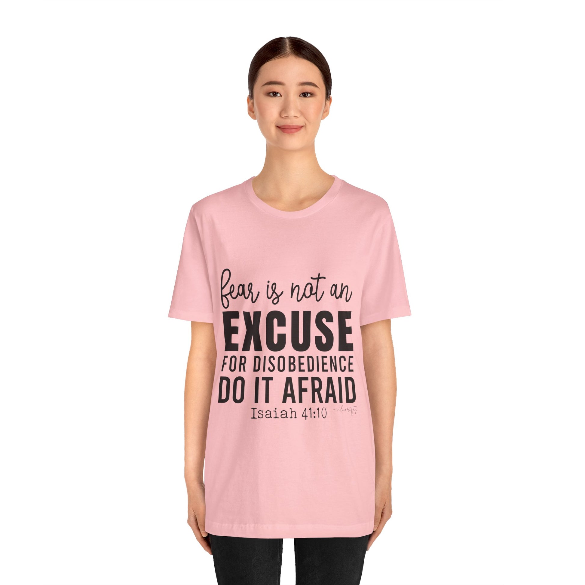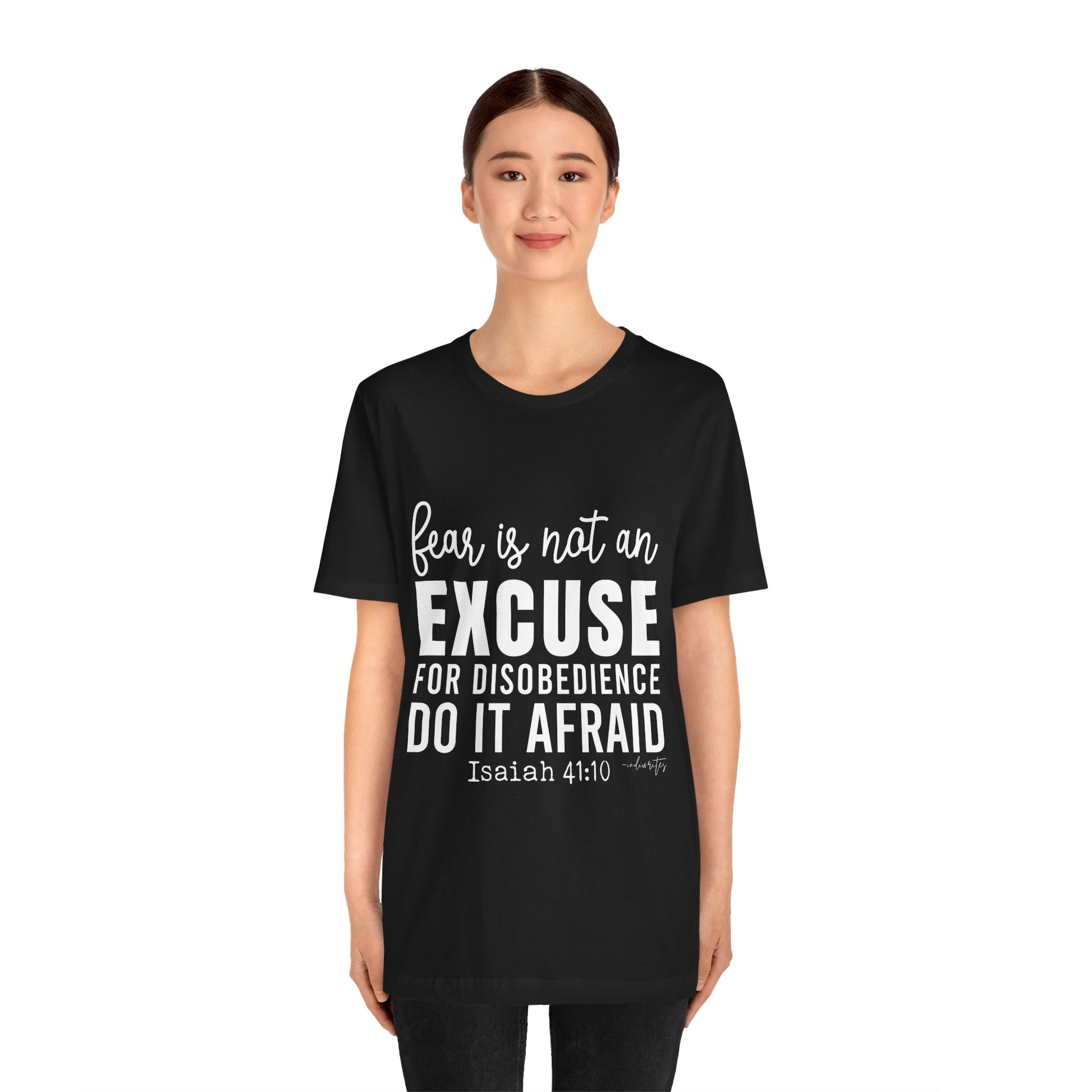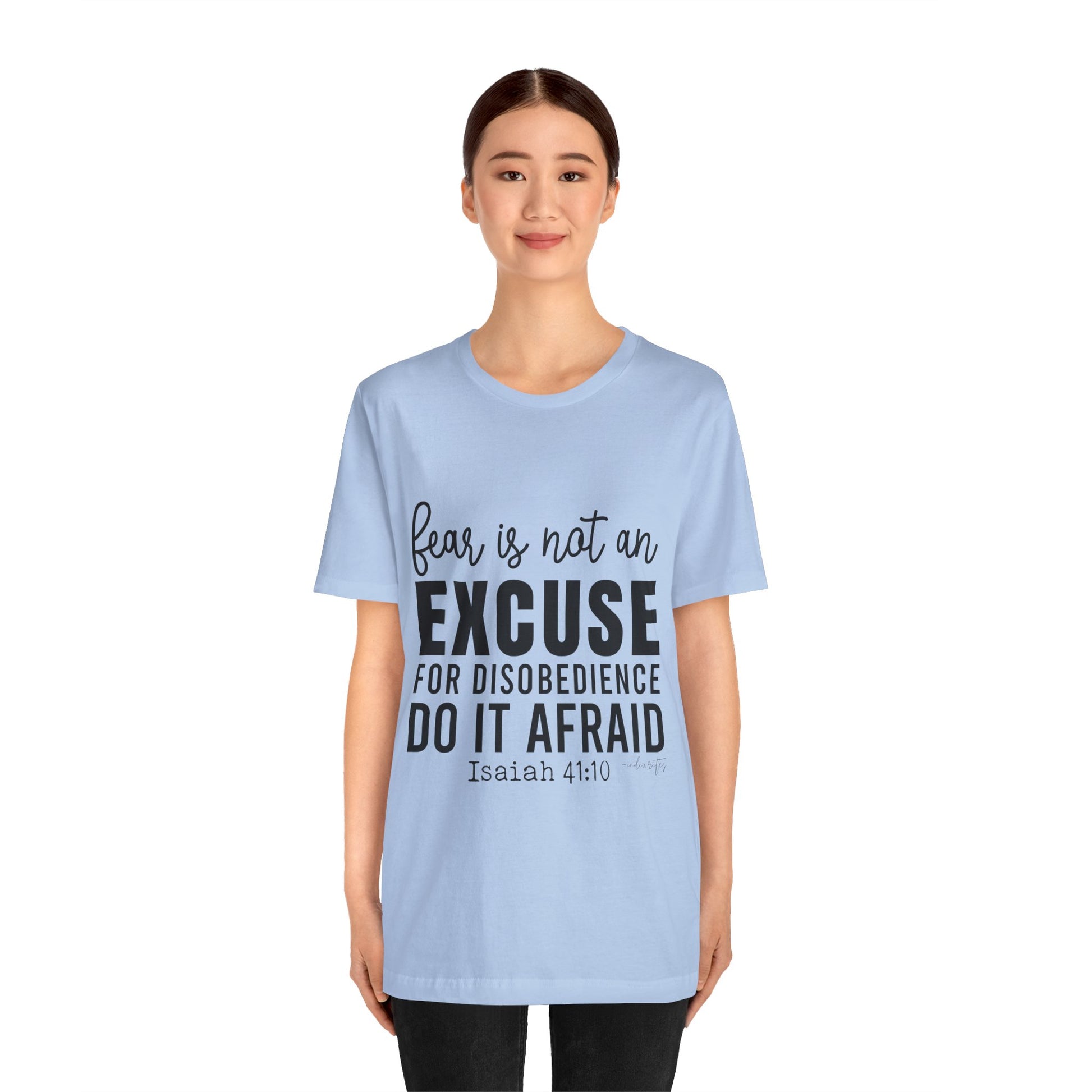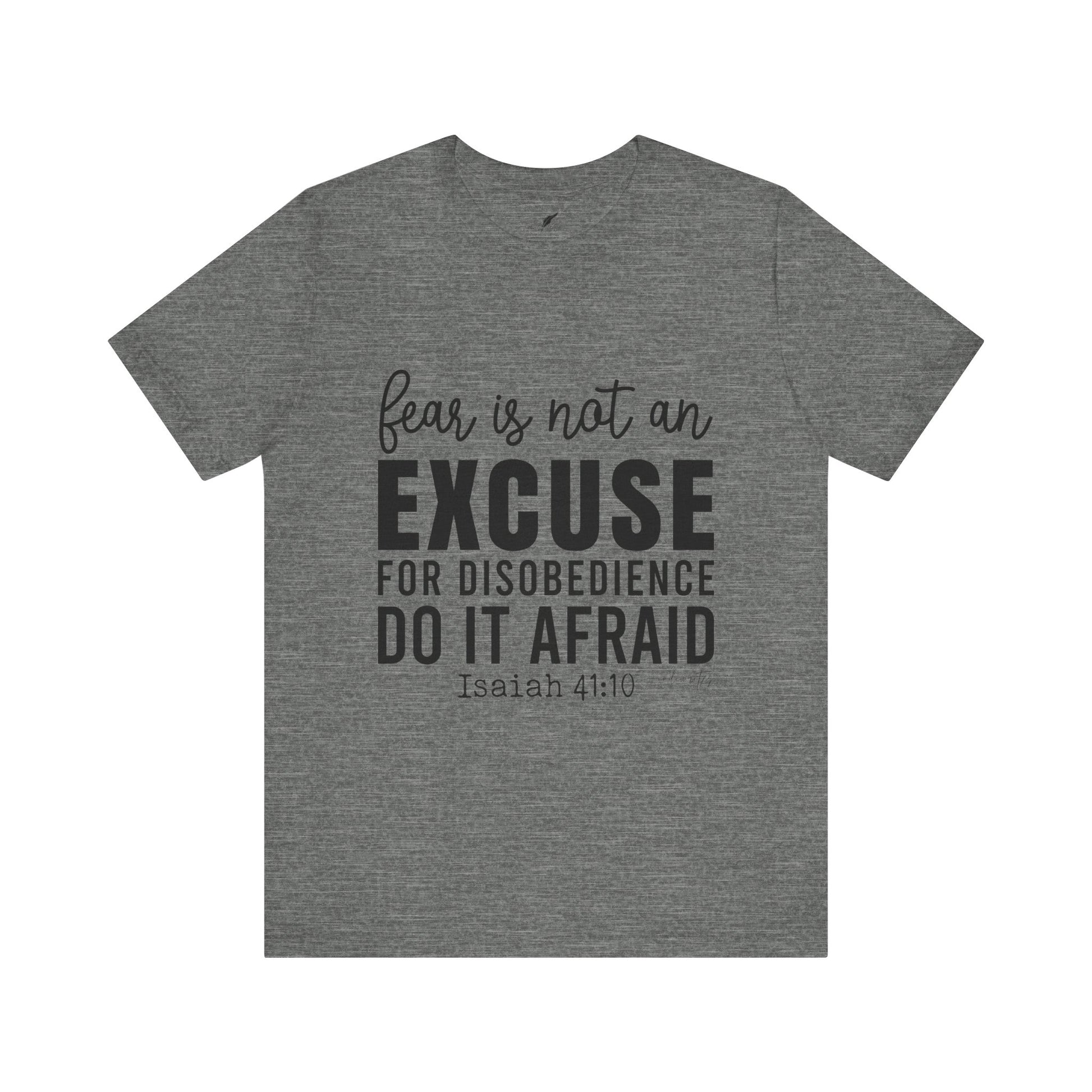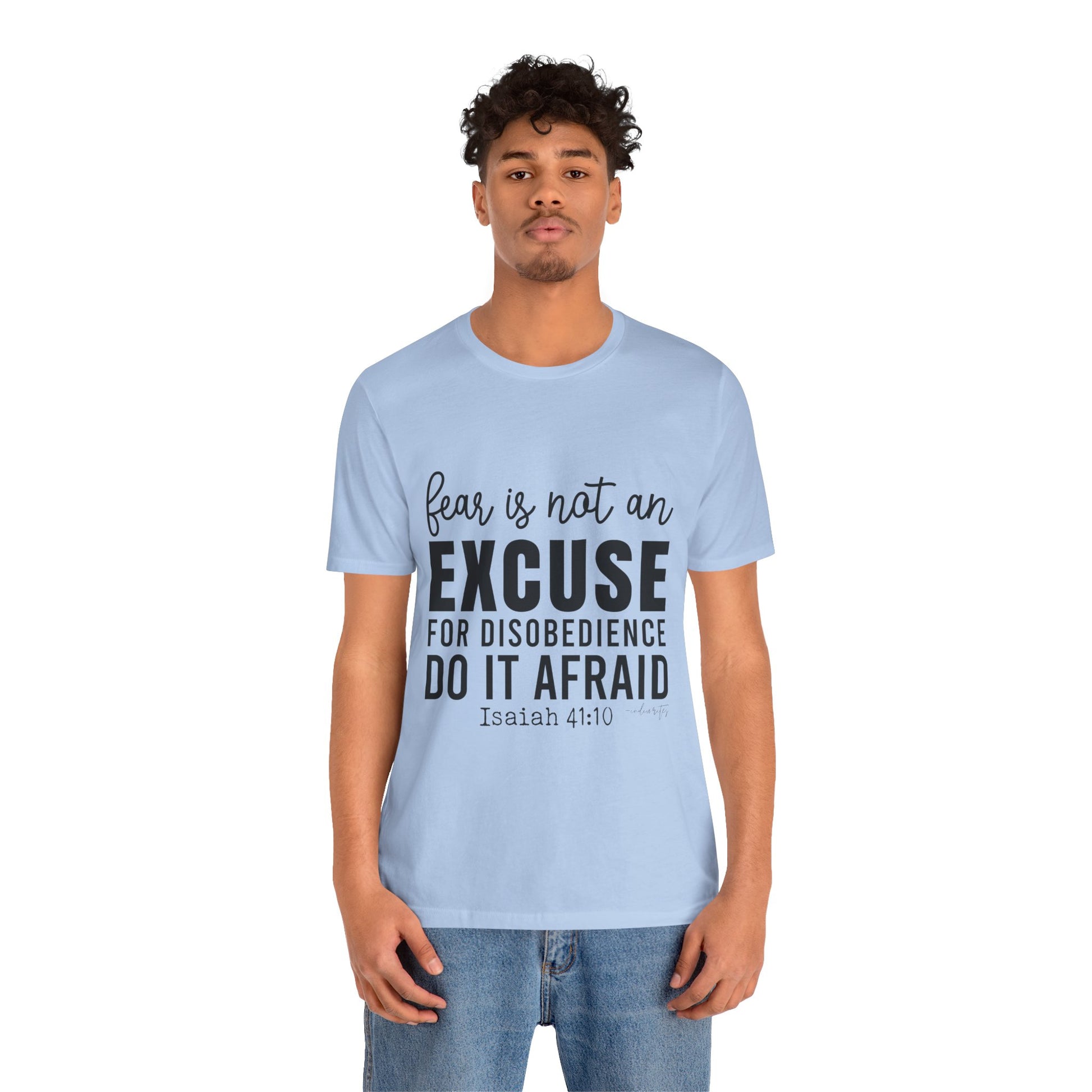 As you wear the "Do It Afraid" T-shirt, you're not just wearing clothing; you're making a bold statement about your faith and your determination to overcome fear through God's strength. This tee captures the essence of Isaiah 41:10, which reassures us of God's presence and strength, even in the face of fear. Let this tee be a source of empowerment, courage, and a reminder that you can achieve great things, even when fear is present. Declare your commitment to let go of excuses with boldness, and inspire others to conquer their fears and take courageous steps toward their goals.